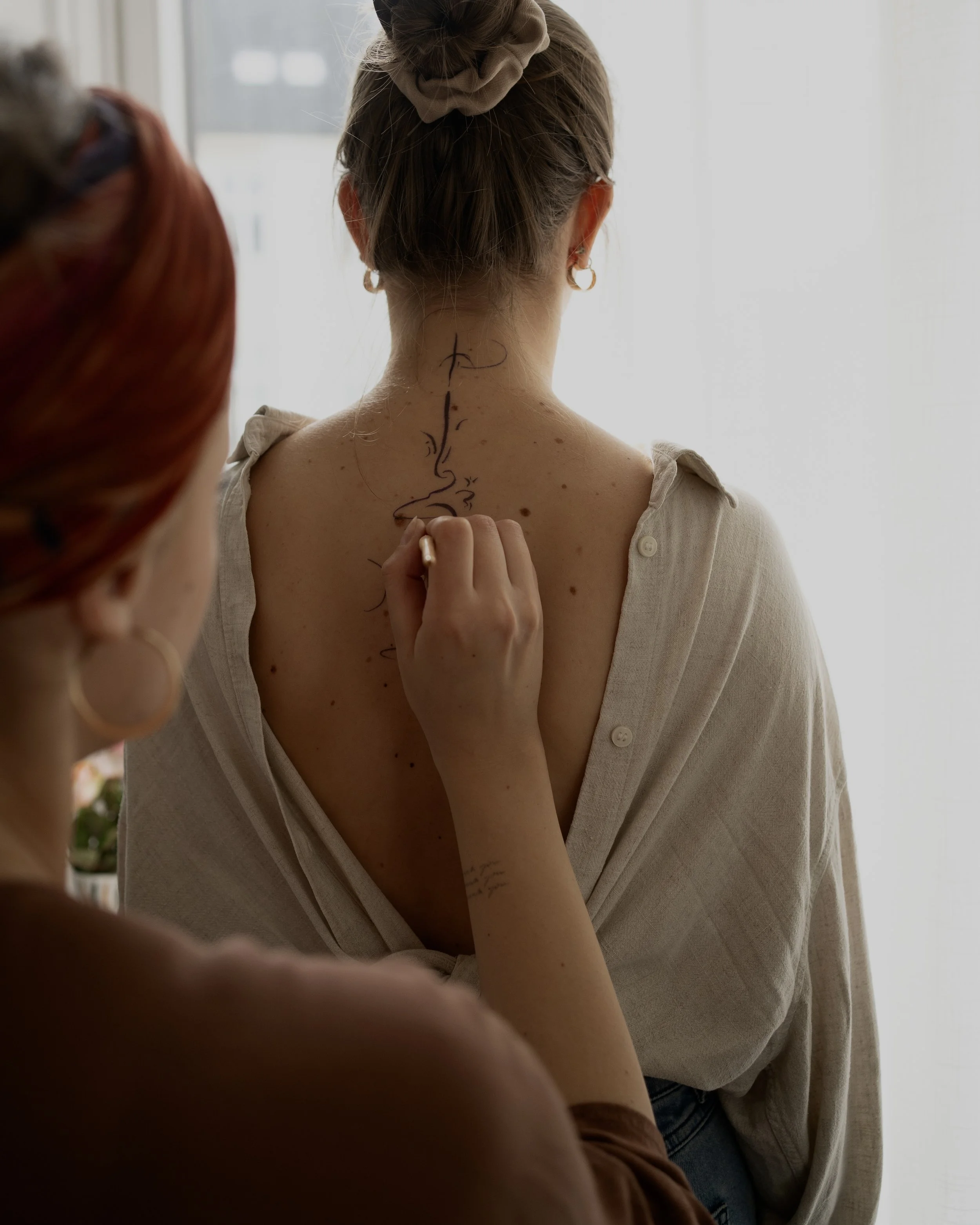 Es gibt keine vorbereiteten Entwürfe oder Absprachen, denn das Motiv besteht nur aus einer abstrakten Schrift, Symbolen & geometrischen Mustern, die ich in dem Moment direkt auf deine Haut zeichne.